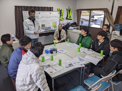 見学会では、有限会社大膳建設や北九州市上下水道局の方から工事概要の説明を受けた後、送水管布設工事を見学しました。また、質疑応答形式で、水道事業の将来や、大手ゼネコンや地場企業で働くことのやりがいや違いなどについても本音でいろいろと教えていただきました。