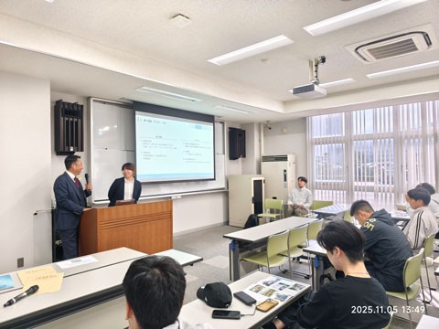 2025年11月5日(水)の工学部 総合システム工学科 土木工学系3年生を対象とする「キャリアデザインII」の講義において、株式会社松尾設計より立石 太郎 氏、本学土木工学系卒業生の上田 晃子 氏、山田 翼 氏をお招きし、建設コンサルタントとしての業務内容や、地元北九州のインフラ整備への貢献についてご講演いただきました。立石氏からは、業界研究の観点から建設コンサルタントの役割や仕事内容、求められる人材像などについて、具体的な事例を交えながらご説明いただきました。続いて、本学卒業生である上田氏と山田氏からは、現在の担当業務の紹介に加え、仕事のやりがいや働く意義、さらには就職活動の経験談など、学生にとって身近で貴重なお話を熱く語っていただきました。