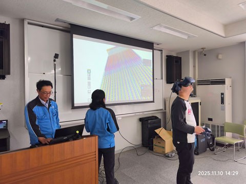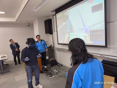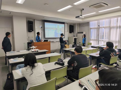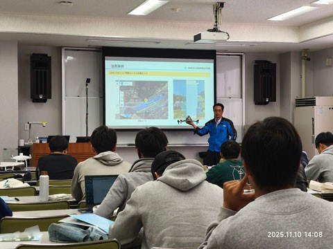 2025年11月10日(月)の工学部 総合システム工学科土木工学系3年生を対象とする「キャリアデザインII」の講義において、山陽建設株式会社の大木義郎氏より、建設分野における建設DXの現状と事例についてご講演いただきました。建設分野では i-Construction が推進されており、その中で特に DX(デジタルトランスフォーメーション)による業務の効率化や高度化が求められています。大木氏からは、ローラー転圧管理、BIM/CIM を活用した干渉箇所の可視化、ドローンによる平面と斜面計測、VRデータを活用した3Dステックなどについて、具体的な事例を挙げながら詳しく説明していただきました。講義後半では、AR を用いたバーチャル現場の観察や計測なども教室で体験し、学生にとって最新の建設技術を理解するとともに、現場のリアルに触れる大変貴重な機会となりました。