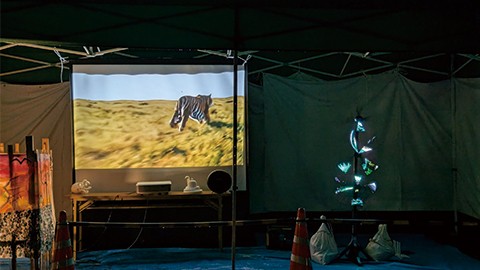 今年の展示作品は、虎、ウサギ、龍、蛇の4種類の干支の映像を制作し、スクリーンとホログラムディスプレイを用いて展示を行いました。制作にあたって、干支の動物らしさを残しつつ、迫力がある映像にすることが課題でした。そのために、たくさんの試作映像を制作し、試行錯誤しながらチームで制作を進めました。また、私たち趙研究室で制作しているニュース番組「NIT+(ニットプラス)」が、昨年と同様に灯籠祭の発信のために撮影を行いました。その中で、上毛町の方々への取材や、イベントの様子の撮影を行い、視聴者にわかりやすい映像制作にすることを共有しました。