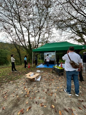 当日は雨が降っており、映像の投影準備に苦労しましたが、無事に設置は行えました。多くの方が映像作品を見るために足を運んでくださり、嬉しく感じています。「NIT+」の取材では、上毛町の方へインタビューを行いました。雨の中、ご対応いただき、ありがとうございました。