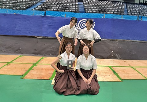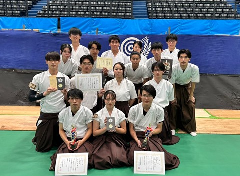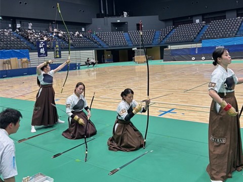 本学の男子団体は64射49中で予選1位となり、優勝を目指して決勝リーグ戦に臨みました。リーグ戦は混戦となり1位から3位までが5勝2敗。本学男子団体は1中差の惜敗が2試合あり4勝3敗総的176中で第4位となりました。男子団体は総合的中数では第1位となり、参加大学の中から1校選ばれる優秀射技校として表彰されました。そして、2026年6月に明治神宮弓道場で開催予定の「第38回全国大学弓道選抜大会」の出場権(30回目)を獲得しました。