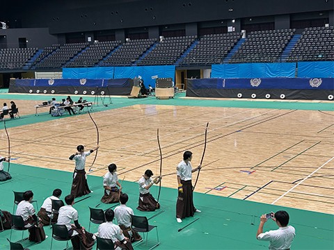 「第63回九州学生弓道選手権大会」が2025年9月30日(火)から10月2日(木)にかけて、福岡市総合体育館(照葉積水アリーナ)で開催されました。男子団体予選は4人立2チームの8人編成で各自4射の合計32射を2立行います。女子団体は4人編成で合計32射の的中で競います。続いて男女とも的中数上位8校で決勝リーグ戦を競います。