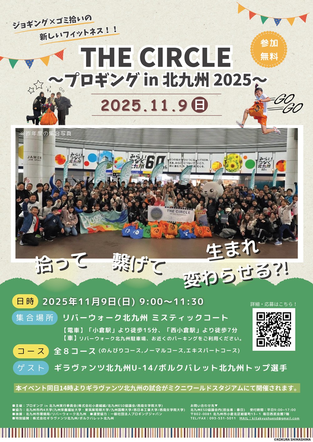 2025年11月9日(日)に、プロギング in 北九州実行委員会主催で「THE CIRCLE ~プロギング in 北九州2025~」が実施され、西南女学院大学、九州栄養福祉大学・東筑紫短期大学、九州国際大学、西日本工業大学による「4大学連携地域活性化事業」が企画参加しました。企画の目的には、「北九州市の都市戦力への貢献」を掲げ、若者が関わり続けれる仕組みの構築を考えてます。本学からはサッカー部を中心に約20名の学生が運営に携わりました。