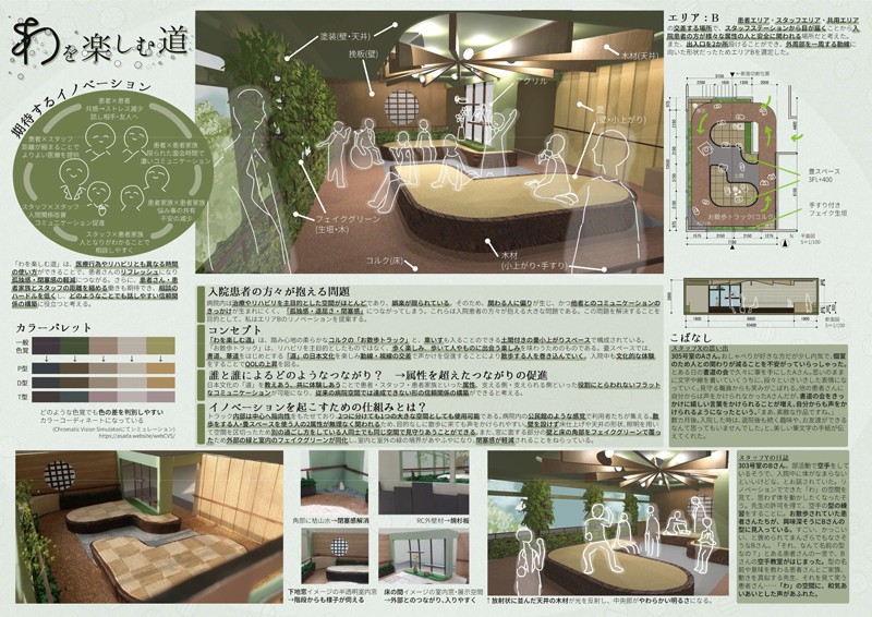 病院の患者・スタッフ・共用エリアの間に、土間付き畳スペースとコルク床のお散歩用トラックを組み合わせた空間を設計しました。そこで書道や華道など日本文化の「道」を体験し教え合うことで、医療行為やリハビリとは異なる時間を過ごし、患者・スタッフ・患者家族の垣根を越えたコミュニケーションが可能になると考えます。