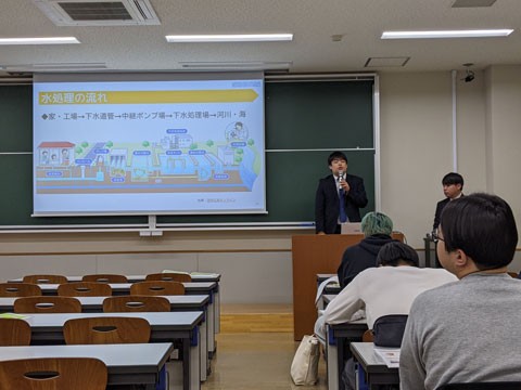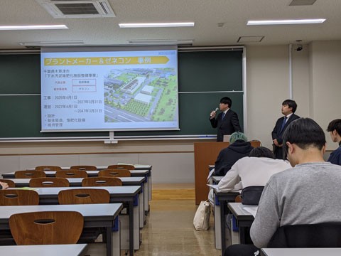 受講学生からは「建設業といえばゼネコンしか知らなかったが、水処理プラントメーカーにも就職できると知って興味をもった」などの感想が聞かれました。