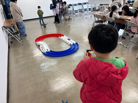 もう一つの目玉は、電池で動くおもちゃを使ったコントロール体験。今回はおもちゃ本体を改造するのではなく、Bluetooth通信機能を持つ特殊な電池(MaBeee)を装着することで、外側から動きを制御する仕組みを取り入れました。子どもたちが、「あー」と長く声を出し続けると、その音に反応しておもちゃが元気に動き出し、全力の発声でコントロールします。また、スマートフォンと連動した電池が、「振る動作」や「声の大きさ」を検知。一生懸命に声を出し続けながら、振って、叫んで、動かして、おもちゃを操る子どもたちの姿に会場は大盛り上がりとなりました。