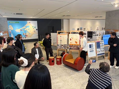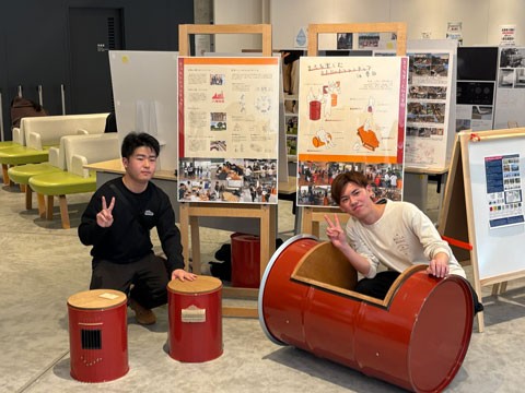 本コンテストは福岡市東区の香椎副都心公共施設なみきスクエアで開催され、審査は2026年2月21日(土)に行われました。プロジェクトチームを代表して、デザイン学部 建築学科3年の宮川知之さんと、同科1年の阿部晟空さんが発表を行い、九大や東京都市大などの卒業制作レベルの出展がある中で、1年生を主体とするプロジェクトチームとして受賞しました。作品は23日(月)まで同会場内で展示されました。